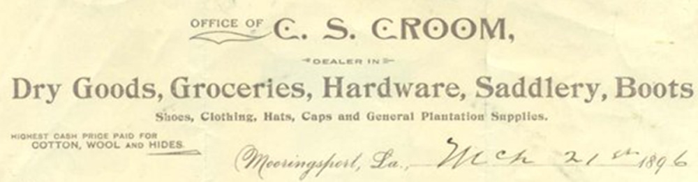 Pre 1914 Post Card of the Caddo Oil Field. Appears to be the current site of AEP Southernwestern Electric Power Company's Lieberman Power Plant at Mooringsport ![]() C. S. Croom Store Letterhead circa 1896 Mooringsport,